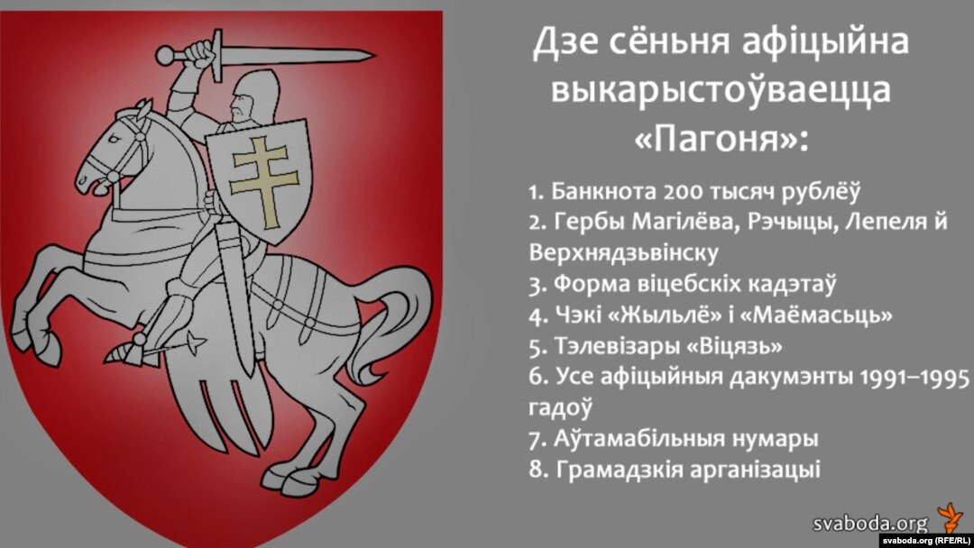 Усе кадэты ў Віцебску штодня носяць «Пагоню» на шаўронах і кукардах. «Пагоня» ёсьць на банкноце 200 тысяч рублёў. Свабода сабрала прадметы, дакумэнты й установы, дзе сёньня афіцыйна выкарыстоўваецца «Пагоня».