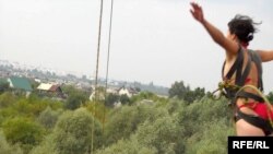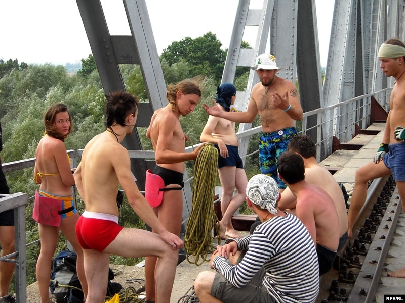 Маладая дзяўчына, апаясаная адмысловай амуніцыяй, з дапамогай сяброў падымаецца на мэталічную канструкцыю моста – і пачынаецца зваротны адлік: тры, два, адзін – пайшла!