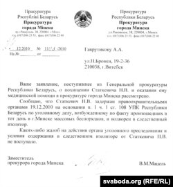 У лісьце, датаваным яшчэ 29-м сьнежня 2010 году, напісана, што Мікалай Статкевіч затрыманы 19 сьнежня паводле распачатай крымінальнай справы аб масавых беспарадках у Менску і што "ніякіх скаргаў на дзеяньні органа крымінальнага перасьледу і ўмовы ўтрыманьня ў сьледчым ізалятары ад Статкевіча не паступала".