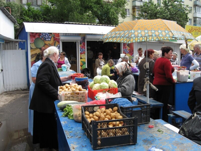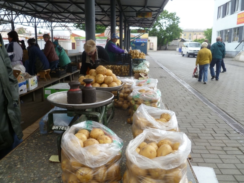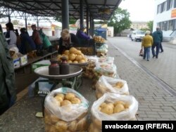 На рынку і на прылеглай тэрыторыі ўсё застаўлена вітаміннай прадукцыяй. Са спадаром сярэдняга веку гутару пра цану на бульбу. На прылаўку яна расфасаваная ў пакункі.