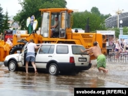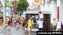 Госьці “Славянскага базару” і жыхары лічылі за лепшае зьняць абутак ды ісьці пехам проста па вадзе. Адзіная “ліўнёўка” каля дому №28 па вуліцы Леніна не спраўлялася з аб’ёмам вады.