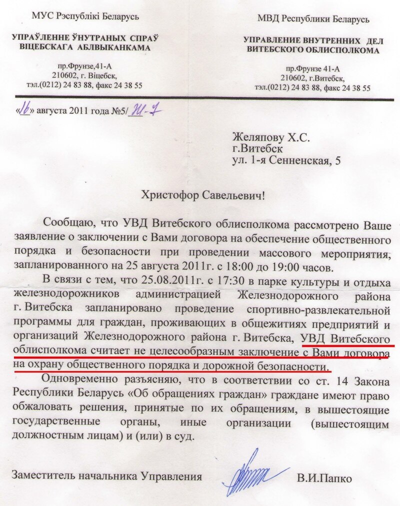 У лісьце, які атрымаў з Чыгуначнай раённай адміністрацыі віцебскі каардынатар руху "За свабоду" Хрыстафор Жаляпаў, прычынай забароны імпрэзы названа адсутнасьць дамоваў на абслугоўваньне імпрэзы службамі ЖКГ, міліцыяй і мэдыкамі.