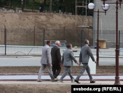 Чыноўнікі падчас праверкі новага фантану і сажалкі.