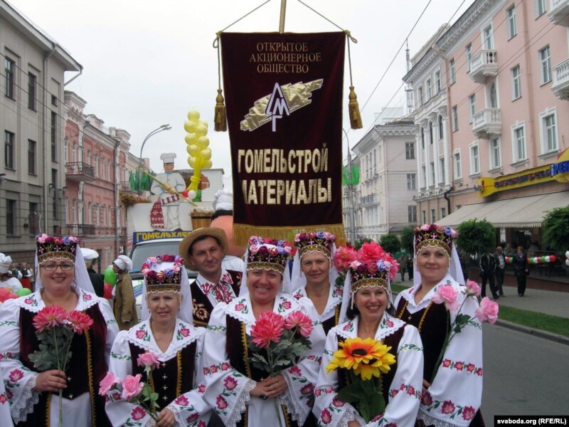 Хаця Гомель сёлета абвешчаны культурнай сталіцай Беларусі, аднак, лёзунгі і транспаранты над калёнамі спрэс аформленыя па-расейску. На расейскай мове напісаны й расьцяжкі перад галоўнай плошчай гораду, куды, паводле сцэнару, накіроўвалася шэсьце.