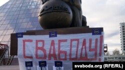 На расьцяжы – партрэты кандыдатаў на прэзыдэнта Андрэя Саньнікава і Міколы Статкевіча, чальца каманды Саньніва Дзьмітрыя Бандарэнкі, кіраўніка Маладога фронту Зьмітра Дашкевіча.