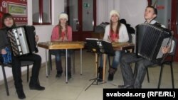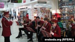 У дзіцячай краме «Бусьлік» рэдкіх пакупнікоў сустракае квартэт цымбалістаў і баяністаў. Дзяўчаты й хлопцы — таксама з каледжу імя Сакалоўскага.