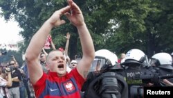 Польскія фанаты масава нападалі на расейскіх гасьцей і ўласных паліцыянтаў. Расейцы шпурляліся фаерамі. Перадаюць, што каля моста Панятоўскага, ронда дэ Голя і ронда Вашынгтона ёсьць параненыя. Туды зьехаліся машыны хуткай дапамогі. Паліцыя трымае напагатове зброю і ўжо адкрывала страляніну ў паветра, каб асьцюдзіць гарачыя галовы.