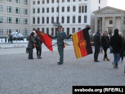 Бліжэй да Брандэнбурскай брамы ўвогуле маскарад: два чалавекі са сьцягамі СССР і ЗША бавяць турыстаў. І не халодна ж ім у вайсковых кіцялях на лютым сіверы? Загартаваліся! На наступны дзень «на працу» выйшаў толькі адзін, «жанглёр» сьцягамі ГДР ды СССР. Вакол яго скупілася «маўклівая, яўна несанкцыянаваная акцыя». Я скалануўся: зараз варанкі наедуць! А там пастарунак, «самы справядлівы і гуманны» суд. Не, ніякай паліцыі! Хоць побач, дарэчы, амэрыканская амбасада.