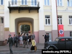 Гасьне сьвятло. «1942 год. Бэрлін», чытаем у цітрах. На экране – таксама цёмная кіназаля, фрыцы глядзяць гёбэльсаўскую агітку… Канец сэансу, публіка спускаецца па прыступках між калёнамі аблвыканкаму ў свастыках і афішах з жаўнерамі вэрмахту. Сярод масоўкі – паэт Юры Гумянюк, якога ня стала сёлета. Але сцэна зусім кароткая, не пасьпяваю зьмеціць.