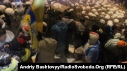 Камунальнікі з дапамогай унутраных войскаў разьбіраюць барыкады мітынгоўцаў на вуліцы Лютэранскай каля адміністрацыі прэзыдэнта ў Кіеве.