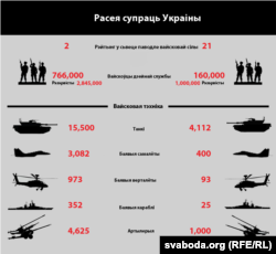 Гэты велізарны дысбалянс у сілах мае сваё адлюстраваньне і ў абаронных бюджэтах абедзьвюх краінаў. Расея штогод выдаткоўвае каля 78 мільярдаў даляраў на свае ўзброеныя сілы, а Ўкраіна — 1,6 мільярда даляраў.