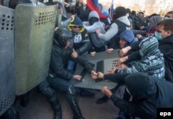 У Харкаве, дзе сёньня прайшоў мітынг за правядзеньне рэфэрэндуму па пытаньні фэдэралізацыі Украіны, міліцыі ўдалося вывесьці з акружэньня прарасейскіх актывістаў амаль 20 эўрамайданаўцаў. Як перадае УНІАН, антымайданаўцы патрабавалі самасуду і, прабіваючыся праз кардон міліцыі, спрабавалі біць эўрамайданаўцаў. Некалькі чалавек атрымалі траўмы.