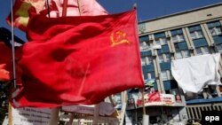 На плошчы перад адміністрацыяй прыкладна дзьве тысячы чалавек. Людзі стаяць са сьцягамі, амаль ва ўсіх прысутных на вопратцы георгіеўскія стужкі.