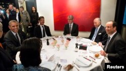 На абедзе з прэзыдэнтам Злучаных Штатаў Баракам Абамам цэнтральнай тэмай абмеркаваньня быў крызыс ва Ўкраіне. Абама выказаў занепакоенасьць францускімі плянамі прадаць Расеі верталётаносцы «Містраль». Прэзыдэнт ЗША назваў гэта «незаслужанай узнагародай Расеі за яе паводзіны ва Ўкраіне».