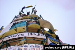 На майдане Незалежнасьці ў Кіеве адной з асноўных адметнасьцяў дагэтуль застаецца навагодняя ёлка, упрыгожаная плякатамі, сьцягамі і іншымі сымбалямі пратэсту, які зьмяніў Украіну.