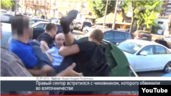Кіраўніка адэскага абласнога Фонду сацыяльнага страхаваньня схапілі падчас атрыманьня хабару, аднак яму ўдалося захаваць працоўнае месца. Актывісты «Правага сэктара» вырашылі дадаткова пакараць вінаватага чыноўніка. Актывісты падпільнавалі мужчыну ля працы, схапілі яго і пасадзілі ў бак са сьмецьцем.