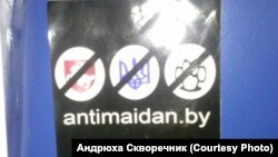 На налепках закрэсьленая «Пагоня», украінскі «Трызуб» і подпіс — «Антымайдан». На іншай налепцы напісана «Падтрымліваем прызнаньне Наваросіі».
