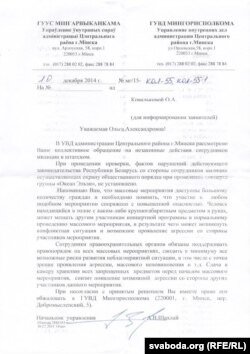 «У сваім адказе УУС прызнала, што на канцэрце дзейнічалі супрацоўнікі міліцыі ў цывільным і іх дзеяньні прызнаныя законнымі, але ніякай спасылкі на заканадаўчыя акты Беларусі, на падставе якіх яны дзейнічалі „законна“, у адказе не прыводзіцца, — падкрэсьлівае Вольга Кавалькова. — Згодна з артыкулам 18 Закона РБ „Аб зваротах грамадзянаў і юрыдычных асобаў“, пісьмовыя адказы павінны быць абгрунтаванымі і матываванымі (пры неабходнасьці — са спасылкамі на нормы заканадаўства), зьмяшчаць канкрэтныя фармулёўкі і фармулёўкі, якія аспрэчваюць ці пацьвярджаюць аргумэнты заяўнікаў. Адказ з УУС не ўтрымлівае гэтых патрабаванняў. У сваім камэнтары наконт украінскіх сьцягоў міністр унутраных спраў Шуневіч таксама не спасылаўся на заканадаўства Беларусі».