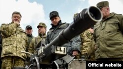 Прэзыдэнт Украіны Пятро Парашэнка ў навучальным цэнтры Нацыянальнай гвардыі Ўкраіны агледзеў узоры новага ўкраінскага ўзбраеньня.
