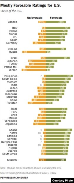 У саміх ЗША балянс ацэнак памяркоўна станоўчы, выразна станоўчыя ацэнкі ў Эўропе, ва Ўкраіне зьнешнюю палітыку Абамы ўхваліў прыкладна кожны другі апытаны. Рэкордна высокімі аказаліся ацэнкі дзеяньняў амэрыканскага прэзыдэнта на Філіпінах, у Паўднёвай Карэі і ў Аўстраліі, а таксама ў Афрыцы. У Кітаі колькасьць станоўчых і адмоўных ацэнак аказалася прыблізна роўнай. А абсалютным лідэрам адмоўных ацэнак стала ізноў жа Расея.
