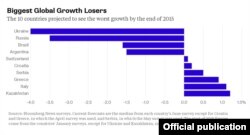 Ня самыя лепшыя паказьнікі будзе мець і Расея, дзе ВУП зьменшыцца на 3,5 адсоткаў да канца году. Гэты спад у вялікай ступені зьвязаны зь міжнароднымі санкцыямі, а таксама падзеньнем коштаў на нафту. Украіна і Расея ў сьпісе аўтсайдэраў Bloomberg займаюць першыя пазыцыі.
