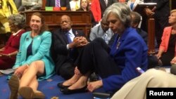 Абураныя адмовай рэспубліканскай большасьці паставіць на галасаваньне праект закону, дэмакраты ў сераду раніцай у поўным складзе разьмясьціліся на падлозе залі пасяджэньняў Палаты прадстаўнікоў і запатрабавалі ад сьпікера, рэспубліканца Пола Раяна, усё ж паставіць законапраект на галасаваньне. Яны адмовіліся падпарадкоўвацца правілам і не дазволілі Раяну правесьці галасаваньне па іншых пытаньнях парадку дня. Рэдкі ў амэрыканскіх абставінах пратэст узначаліў 76-гадовы кангрэсмэн Джон Луіс, вэтэран барацьбы за раўнапраўе афраамэрыканцаў у 60-х гадах мінулага стагодзьдзя.