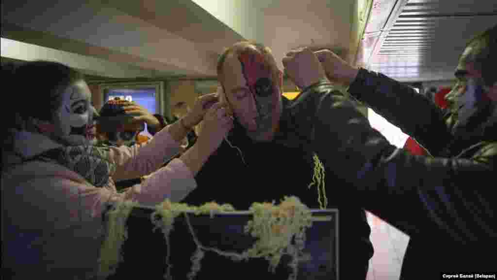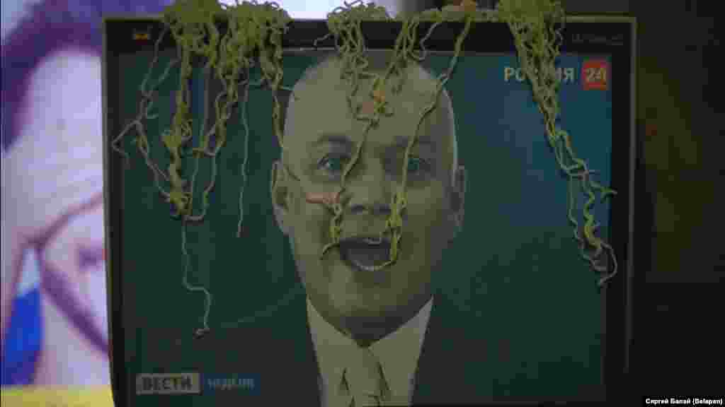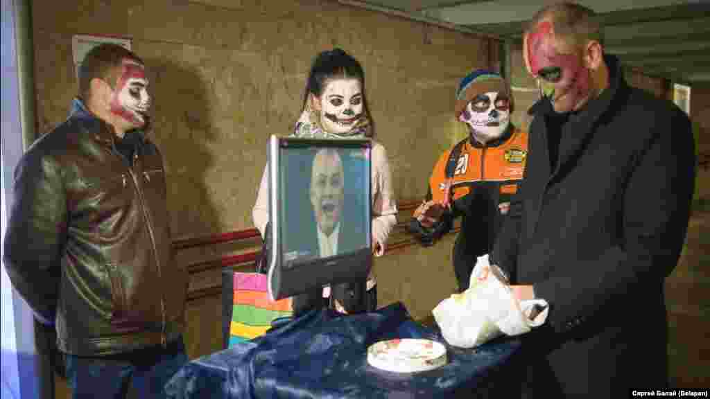 Каля 17:30 пяць чалавек з размаляванымі пад зомбі тварамі ўсталявалі ў падземным пераходзе каля ГУМа макет тэлевізара з партрэтам расейскага тэлевядучага Дзьмітрыя Кісялёва.