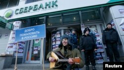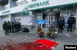 У Кіеве каля аддзяленьняў расейскіх банкаў прайшлі акцыі пратэсту партыі «Нацыянальны корпус» і карпусу «Азоў». Апрануўшыся ў ватоўкі і вушанкі і узяўшы ў рукі балалайкі і настойку «Глог», актывісты расставілі вакол аддзяленьняў «Сбербанка» плякаты «Добра пожаловать в Россию», разьлілі некалькі упаковак з чырвонай фарбай і прапаноўвалі мінакам забіраць уклады з банкаў.
