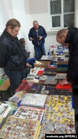Сталы спадар, што падняўся па прыступках, каб паглядзець нумізматычныя шэрагі, прызнаўся, што ўбачыў на плошчы машыны рэтра і зацікавіўся. Можа быць нават трэба было ўзяць свае рэчы з калекцыі і абмяняцца, выказвае ён думку. Што ён зьбірае сам? Манэты, старыя, царскія. І даваенныя літоўскія, польскія, латыскія. Тут ёсьць значкі, якія ёсьць і ў яго, савецкія: