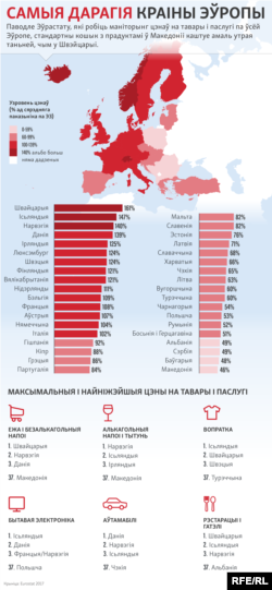 Якія краіны Эўропы самыя дарагія, а якія найтаньнейшыя, дзе ў Эўропе тавары можна купіць за самую нізкую цану, а дзе кошт максымальны.