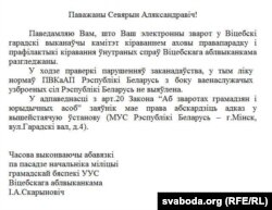 Публіцыст Свабоды Севярын Квяткоўскі атрымаў адказ зь міліцыі грамадзкай бясьпекі Віцебскага аблвыканкаму: