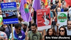 Эўрапейскія актывісты пратэстуюць супраць прыезду прэзыдэнта ЗША Дональда Трампа, які на наступным тыдні возьме ўдзел у саміце NATO.