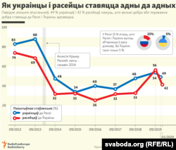 Паводле апошніх апытаньняў, 49% украінцаў і 42% расейцаў кажуць, што вельмі добра або пераважна добра ставяцца да Расеі і Ўкраіны адпаведна.