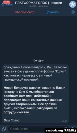 З фальшывых рахункаў Сьвятланы Ціханоўскай, плятформы «Голас» і некаторых іншых каналаў беларускім карыстальнікам прыходзяць паведамленьні, што іх тэлефонны нумар нібыта ўнесьлі ў базу «як кантакт чалавека з актыўнай грамадзянскай пазыцыяй» і перададуць кантактныя зьвесткі «іншым прыхільнікам пераменаў».