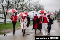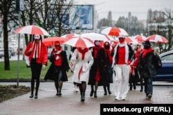 У Менску жанчыны зь бел-чырвона-белымі парасонамі выйшлі на шпацыр.