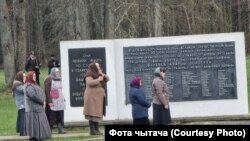 На відэа і фотаздымках, якія прыслаў чытач Свабоды, відаць, як салдаты вэрмахту і мужчыны ў цывільным гвалтам вядуць мірных жыхароў, потым выбягаюць дзяўчаты з кавалкамі чырвонай тканіны, імітуюць агонь, у якім спалілі людзей.