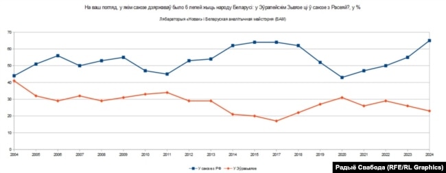 Таксама зьвяртае на сябе ўвагу супрацьлеглая дынаміка пасьля 2013 году: ва Ўкраіне — рост праэўрапейскіх настрояў, у Беларусі — іх зьніжэньне.