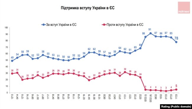 Вынікі апытаньняў «Рэйтынгу» пацьвярджаюць дадзеныя акадэмічных сацыёлягаў: пасьля анэксіі Крыму і пачатку гібрыднай вайны ў Данбасе ў 2014 годзе — заўважны рост праэўрапейскіх настрояў, і выбуховы іх рост пасьля пачатку поўнамаштабнай вайны.