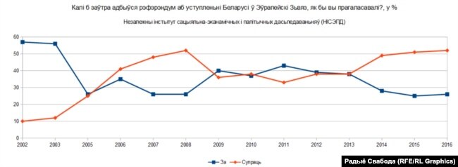 Напачатку нулявых апытаньні НІСЭПД фіксавалі выразную перавагу праэўрапейскіх настрояў у Беларусі, іх узровень быў нават вышэй за той, якія ў адпаведныя гады паказвалі апытаньні ўкраінскіх сацыёлягаў. Аднак у 2006–2008 гадах назіралася ня менш пераканаўчая перавага адмоўнага стаўленьня да далучэньня Беларусі да ЭЗ.