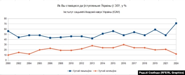 Апытаньне 2024 году зафіксавала выбуховы рост праэўрапейскіх памкненьняў украінцаў.