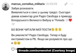 Той допіс Андрэя пра пераход на беларускую мову ў Threads набраў 2 тысячы падабаек. Раней толькі два іншыя ягоныя допісы выклікалі большую рэакцыю. Ён адзначае, што ў асноўным людзі адрэагавалі пазытыўна, за выключэньнем «ботаў».