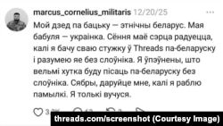 «Магчыма, гэта мне дасьць крыху больш практычнага ўжываньня мовы, якога мне не хапае. Гэта толькі мінімум, які я магу зрабіць, каб ушанаваць памяць Мікіты. Магчыма, калі ён існуе ў нейкім паралельным вымярэньні, то сьмяецца зь мяне і маіх спробаў весьці Threads па-беларуску», — кажа Андрэй.