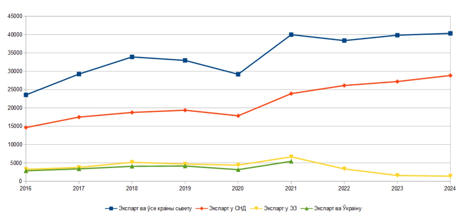 — У 2021 годзе ў экспарце тавараў зь Беларусі на Эўразьвяз і Ўкраіну прыпадала 30%, каля 12 мільярдаў даляраў. Ужо ў 2022 годзе экспарт тавараў зь Беларусі ва Ўкраіну зьменшыўся да нуля, экспарт у ЭЗ за 4 гады ўпаў у 10 разоў. Аднак з 2021 па 2026 год экспарт тавараў зь Беларусі ўва ўсе краіны сьвету агулам практычна не зьмяніўся, ён складаў і складае прыкладна 40 мільярдаў даляраў. Коштам чаго, якім чынам была скампэнсаваная страта рынкаў Эўразьвязу і Ўкраіны?