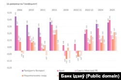 — Пра што сьведчыць дынаміка адказаў на пытаньні аб даверы да дзяржаўных інстытутаў? Графік, які ёсьць у вашым дасьледаваньні, фіксуе пік у 2006 годзе, зьніжэньне да 2018–2020 гадоў і новы ўздым у 2022 годзе. Дык усё вярнулася ў звычайны стан, у 2006-ы год? Ці цяпер прырода даверу іншая?