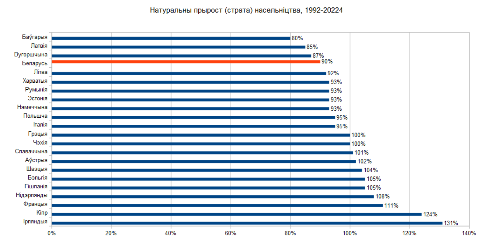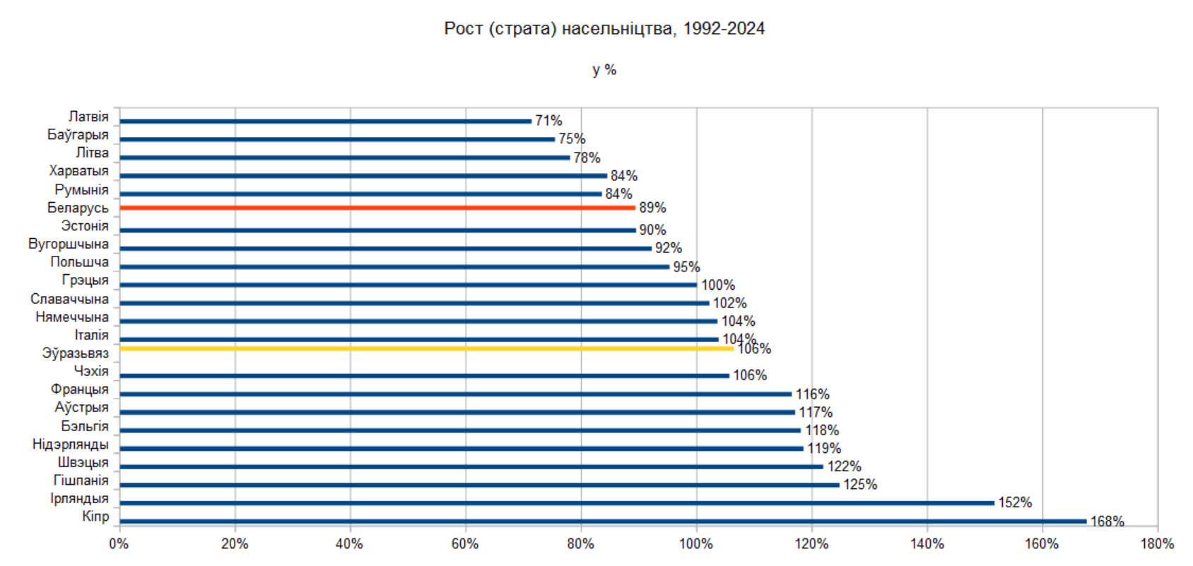 Апошні графік паказвае заўважны падзел — насельніцтва краін Заходняй Эўропы апошнюю траціну стагодзьдзя расло, а ў краінах Цэнтральнай і Ўсходняй Эўропы яно або павялічвалася значна павольней, або зьмяншалася. Насельніцтва Польшчы скарацілася ў меншай ступені, чым у Беларусі, насельніцтва Літвы і Латвіі — у значна большай ступені, чым у Беларусі. Яшчэ тры краіны Эўразьвязу — Баўгарыя, Румынія і Харватыя — зазналі за 32 гады большую страту насельніцтва, чым Беларусь.