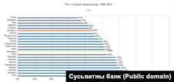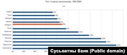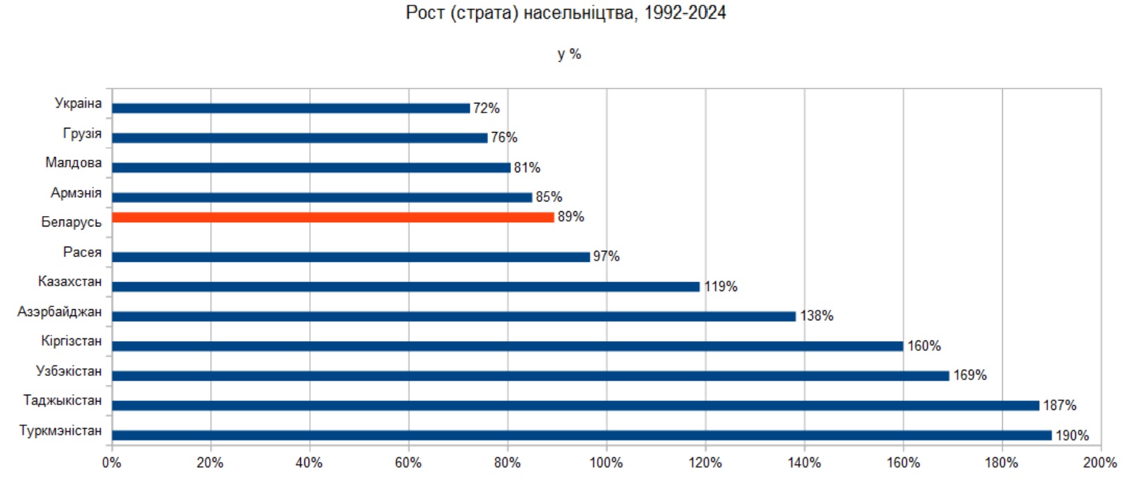 Варта адзначыць, што сярод краін, якія фігуруюць на графіку, самыя заможныя — Расея, Казахстан і Беларусь. Але рэкардсмэны росту насельніцтва — зусім не яны, а даволі бедныя краіны.