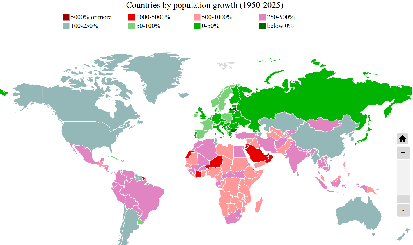 На мапе бачна, што Эўропа і Расея былі ў гэтыя 75 гадоў рэгіёнамі найніжэйшага росту насельніцтва. Найвышэйшымі тэмпамі павялічвалася насельніцтва Афрыкі і Лацінскай Амэрыкі, дастаткова высокімі — Блізкага Ўсходу, Цэнтральнай Азіі, Індыі, памяркоўнымі — ЗША й Кітаю. Насельніцтва Беларусі з 1950 па мінулы год вырасла на 26%.