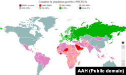 Як гэтая дынаміка выглядае ў параўнаньні з краінамі сьвету і рэгіёну? Наступная мапа паказвае, як зьмянілася колькасьць насельніцтва краінаў Зямлі за тры чвэрці стагодзьдзя.