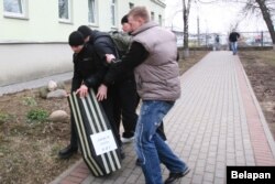 Міліцыянты таксама спрабавалі перашкаджаць працы фотакарэспандэнта БелаПАН Вольгі Кляшчук, матывуючы гэта тым, што будынак ДВП — рэжымны аб’ект.