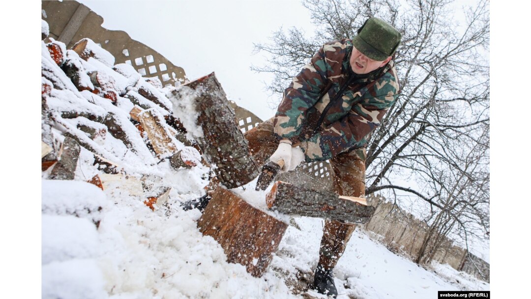 Гаспадар за звыклым зімовым заняткам — сячэ калуном тоўстыя альховыя круглякі. Каб у дзедавай хаце было цёпла, печы мусяць быць загружаныя.
